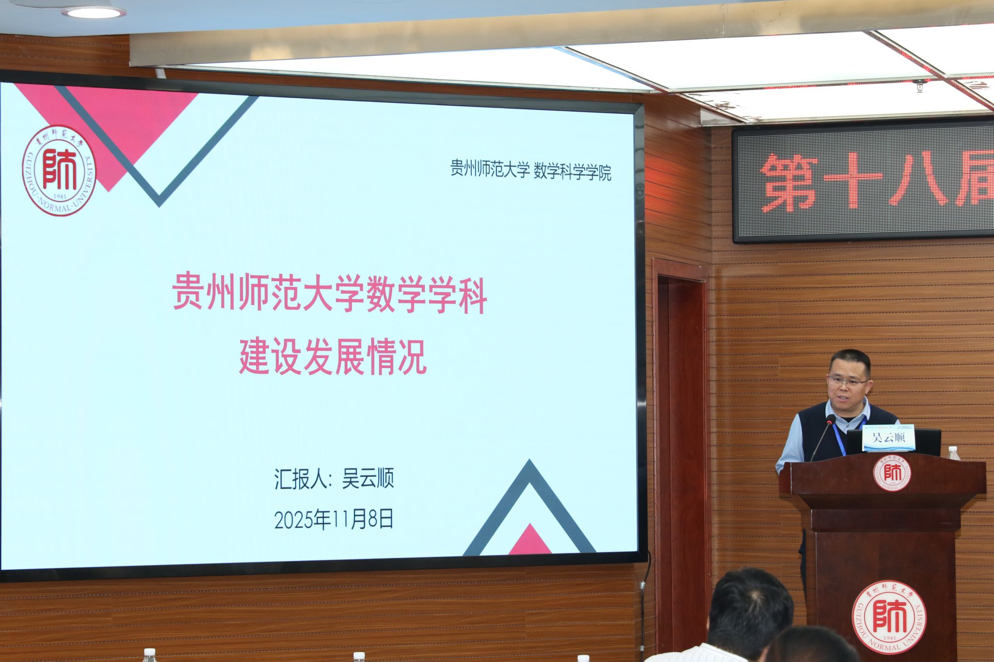 贵州师范大学数学科学学院院长吴云顺汇报了“贵州师范大学数学学科建设发展情况”,表示学院在参与FAST天眼数据处理等重大项目的同时,将持续强化基础教育服务功能,通过系统开展数学科普等工作,不断提升学科的社会贡献度与发展特色。