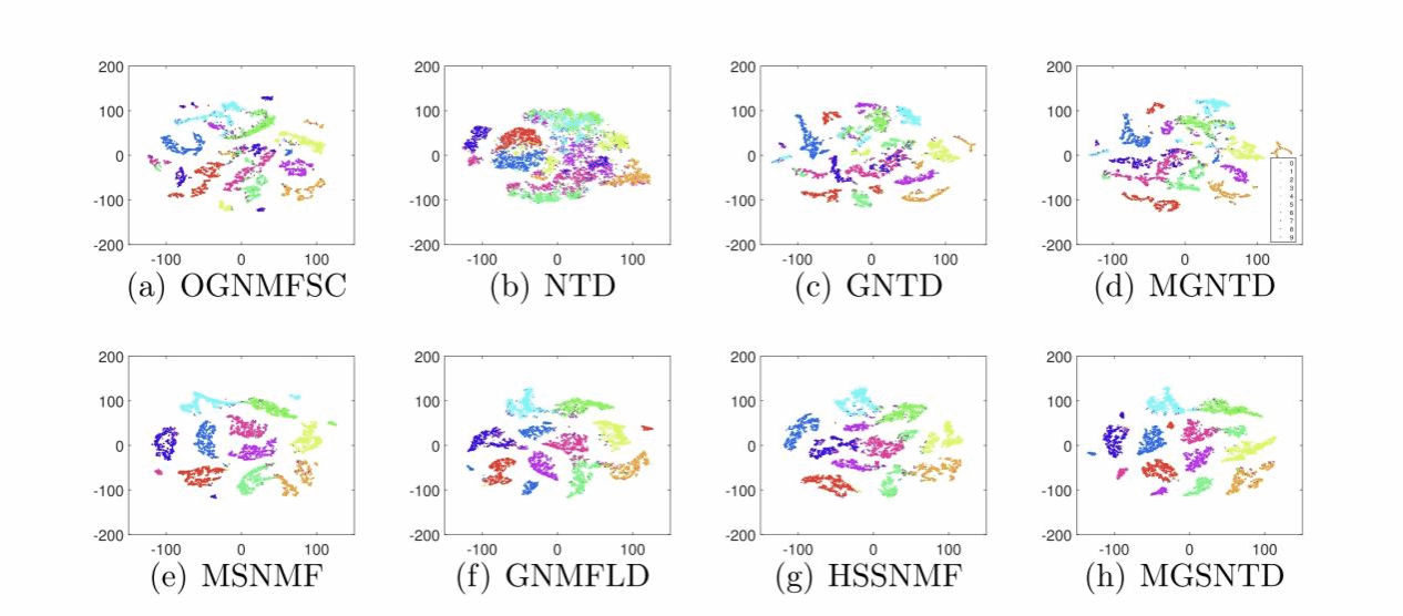 该研究在常用的真实数据集上进行了大量的聚类实验。实验结果表明,提出的无监督MGNTD方法与其它无监督方法比较,在大部分情况下取得了最好的结果;半监督MGSNTD方法与其它半监督方法相比,取得了最好的性能。特别地,在不同数据集上的消融实验进一步表明了文中引入的多图正则化的有效性,即考虑数据空间的多个有意义的表示形式中的图结构优于仅考虑数据空间的单个表示形式中的图结构。这一处理和分析图的方式区别于通常的分析图的方式,它在分析数据空间的图结构方面呈现了一种不同的视角。