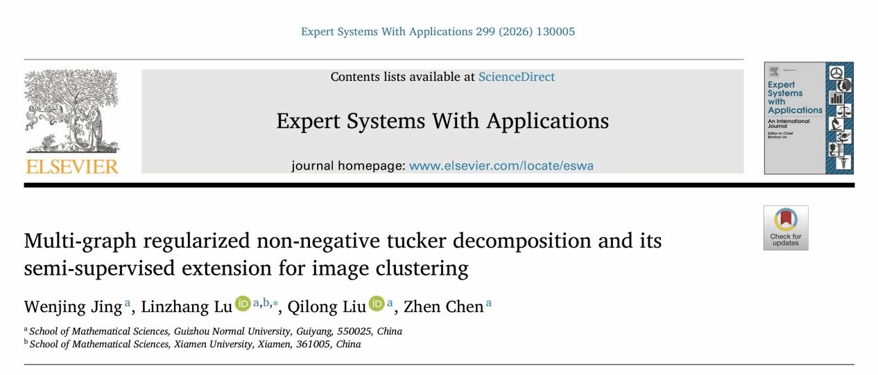 近日,我校数学科学学院卢琳璋教授团队在人工智能领域1区TOP期刊Expert Systems With Applications(IF=7.5)上发表了题为“Multi-graph regularized non-negative tucker decomposition and its semi-supervised extension for image clustering”的研究论文。