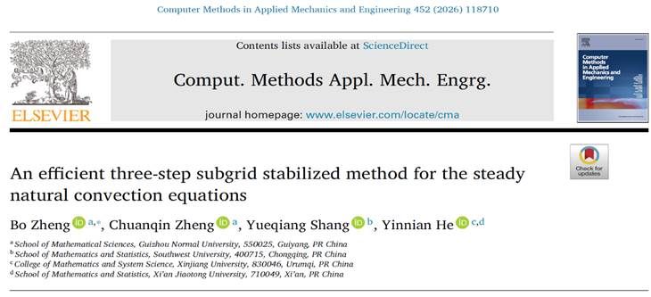 近日,我院郑波老师在计算数学领域国际TOP期刊《Computer Methods in Applied Mechanics and Engineering》(中科院SCI一区,IF=7.3,中国数学会T1)在线发表题为“An efficient three-step subgrid stabilized method for the steady natural convection equations”的研究论文。