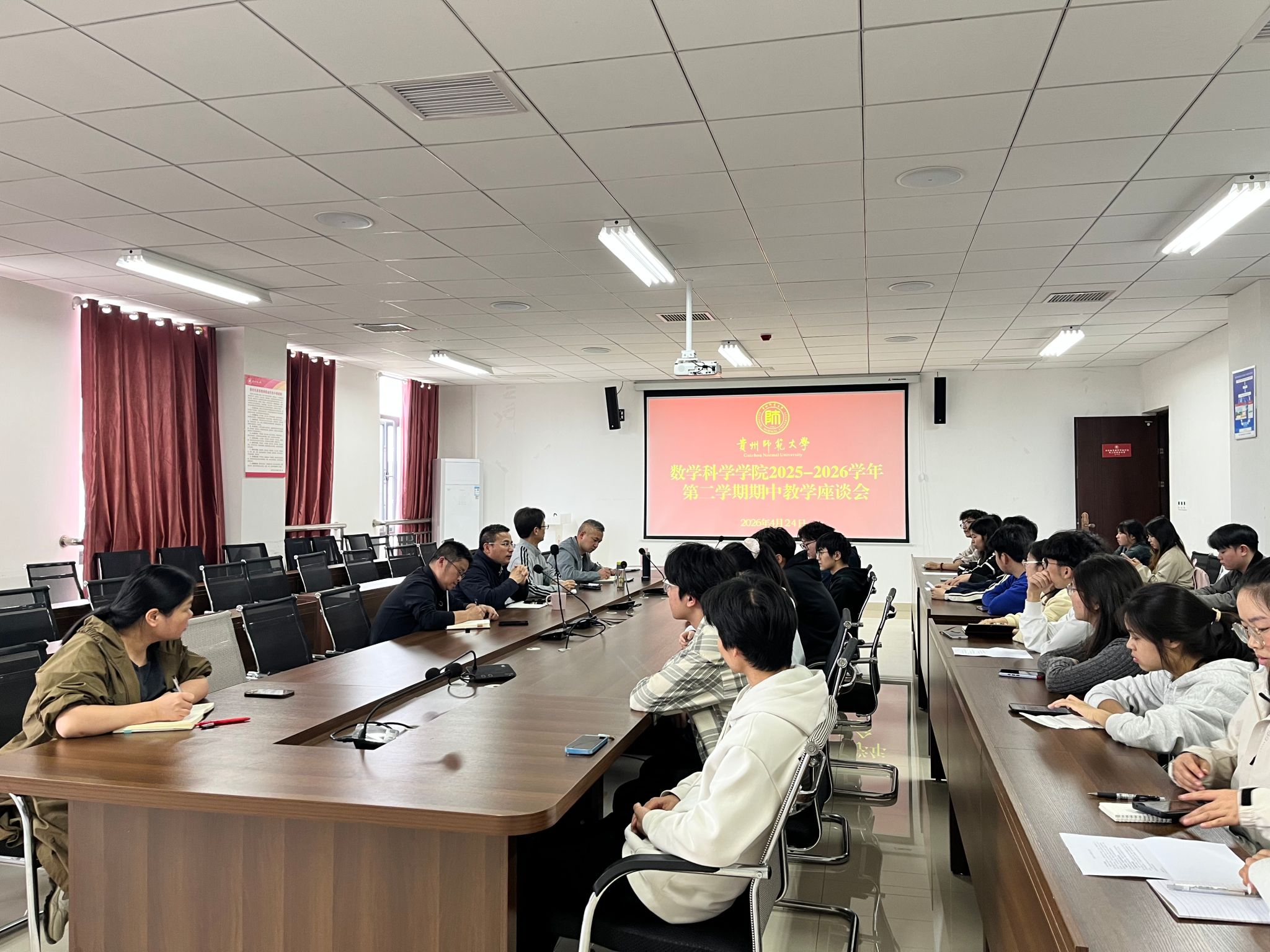 4月24日,我院在学院会议室召开了2025-2026学年第二学期期中学生代表座谈会,学院副院长龙见仁、数学与应用数学系系主任唐树安、应用统计系系主任刘红军、教学委员会主任周鉴、教学管理科科长肖丽、辅导员老师廖清水及各班学生代表近30人参会,会议由龙见仁副院长主持。此次座谈会围绕各班学风建设情况、课程教学安排、实践教学规划及学生学业发展规划等核心议题,展开深入研讨与充分交流。