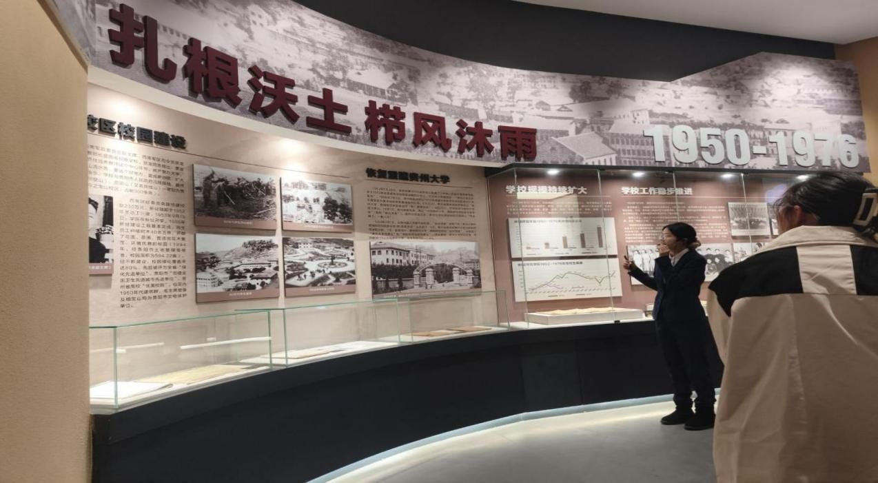 活动中,校史馆讲解员以学校发展时间为脉络,结合馆内珍贵的历史照片、实物展品、文献资料与科技呈现,带领同学们回望学校的发展历程,生动讲述了学校从建校初期的艰辛到发展过程中的关键里程碑——包括学校建立前身、学科建设突破、师资队伍壮大、学校校区拓展、科研成果获奖、杰出领导事迹等重要内容。从早期办学的艰辛探索,到学科建设的突破发展;从育人理念的传承创新,到服务地方的责任担当,每一件展品都承载着学校的奋斗记忆,都让同学们驻足沉思。